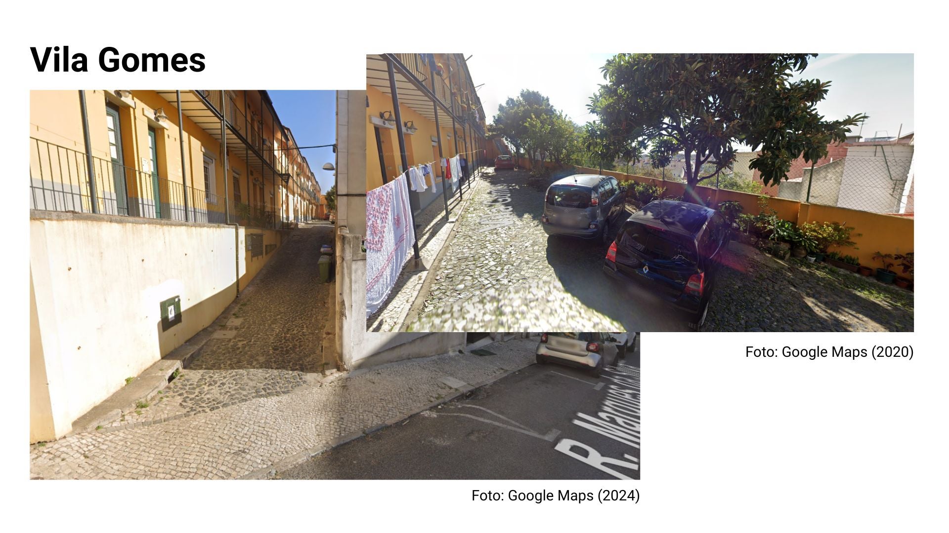 Trouxe algumas fotografias - imagens da Vila Berta, Vila Gomes ou Vila Rosário. Nesses exemplos, há muitos carros e não temos a natureza. Olhando para estas fotos, acredita que temos a oportunidade de transformá-las e de ter um espaço público diferente?