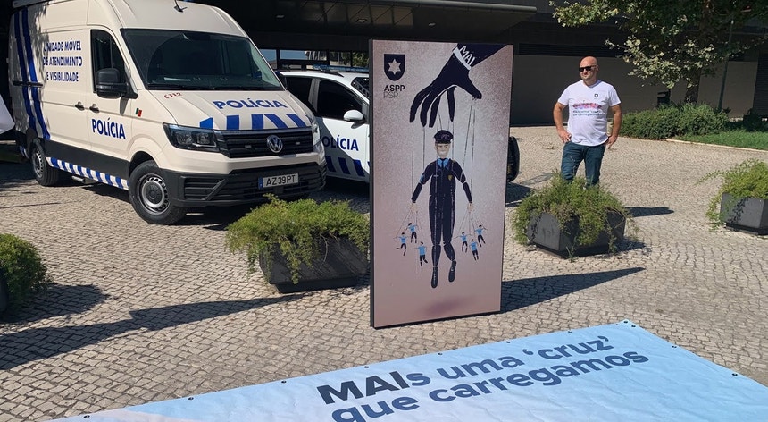 Polícias vestidos de negro a exigirem melhores condições e trabalho apresentam-se esta noite na bancada do Estádio Municipal de Portimão.