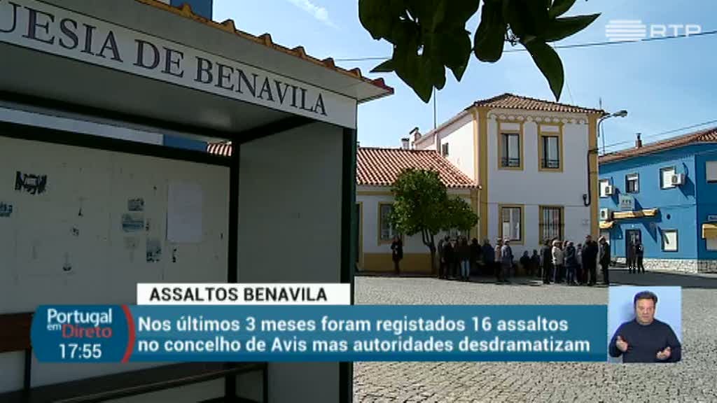 País População de Benavila denuncia falta de proteção contra onda de assaltos Há uma onda de assaltos em Benavila, no concelho de Avis. RTP / VER MAIS A população diz que a situação está a tornar-se insuportável e que nem a lei, nem as autoridades, estão a protegê-los. PUB
