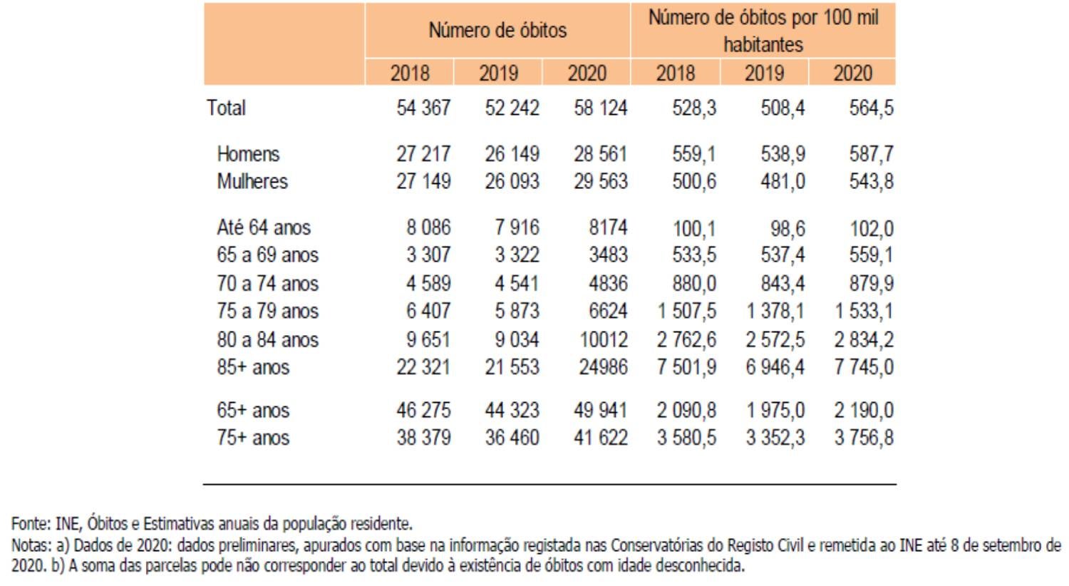 De acordo com a análise do INE sobre o “contexto demográfico e expressão territorial da pandemia Covid-19 em Portugal”, a mortalidade nos últimos seis meses foi ainda superior em 3.757 casos relativamente ao mesmo período de 2018. Este aumento, segundo explica o instituto de estatística, resulta sobretudo do acréscimo do número de óbitos de pessoas com idade igual ou superior a 75 anos, que representam 87 por cento do total da variação positiva nestes seis meses relativamente a 2019.