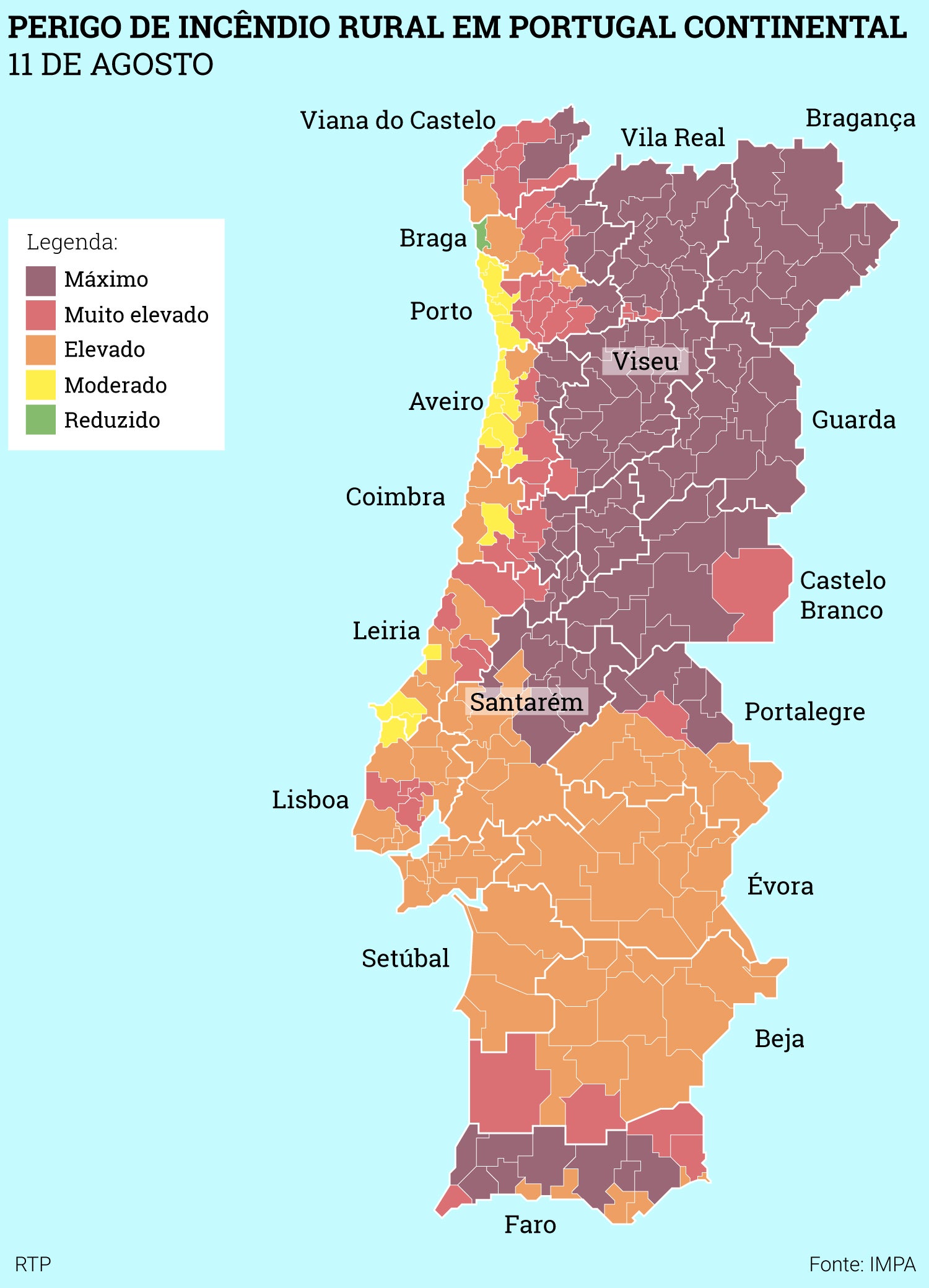 Em risco muito elevado há quase meia centena de concelhos nos distritos de Viana do Castelo, Braga, Porto, Vila Real, Aveiro, Coimbra, Viseu, Leiria, Lisboa, Castelo Branco, Portalegre, Beja e Faro.