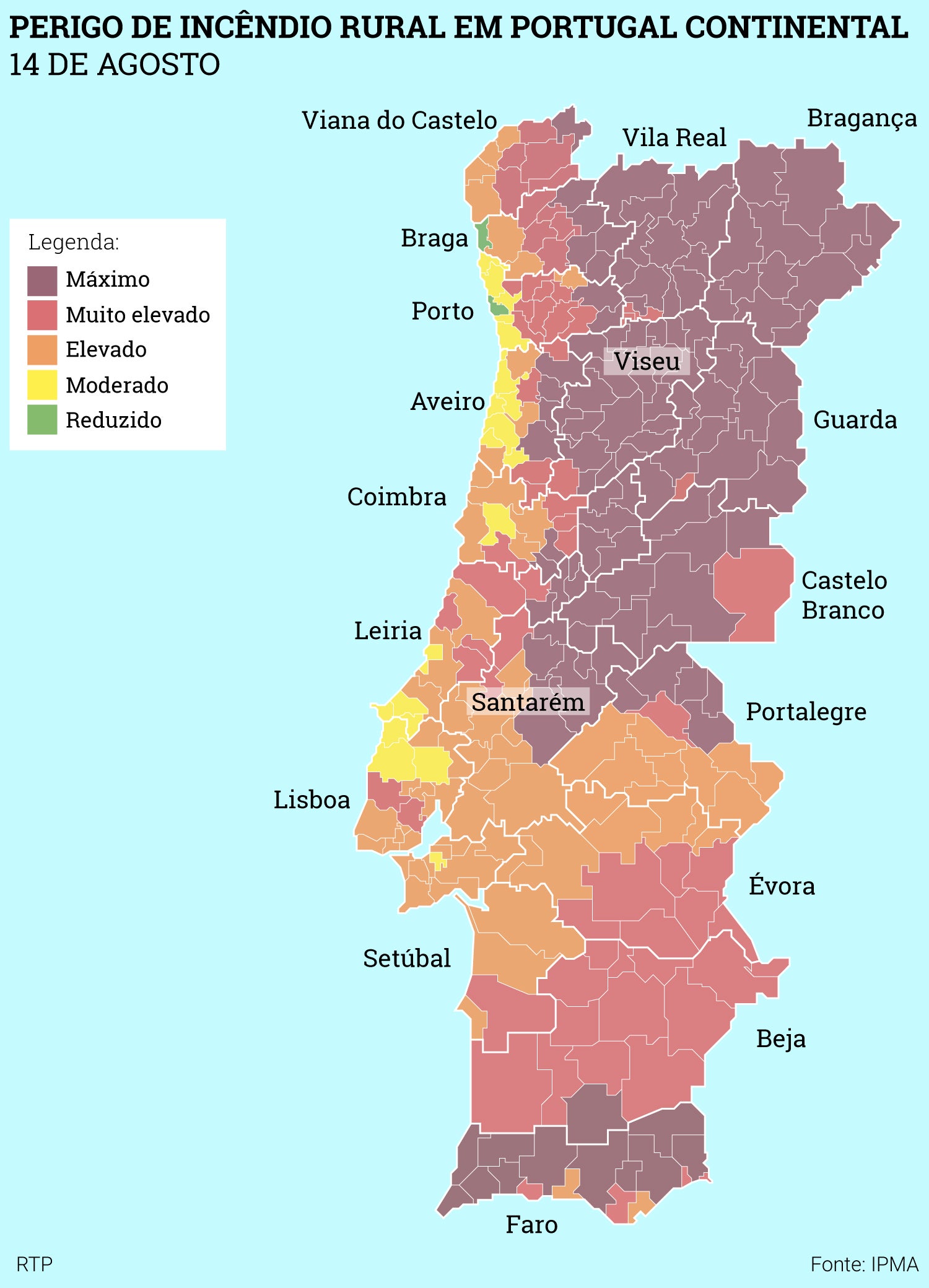Cerca de 60 concelhos nos distritos de Viana do Castelo, Braga, Porto, Aveiro, Coimbra, Leiria, Santarém, Lisboa, Setúbal, Portalegre e Faro estão em risco elevado de incêndio.