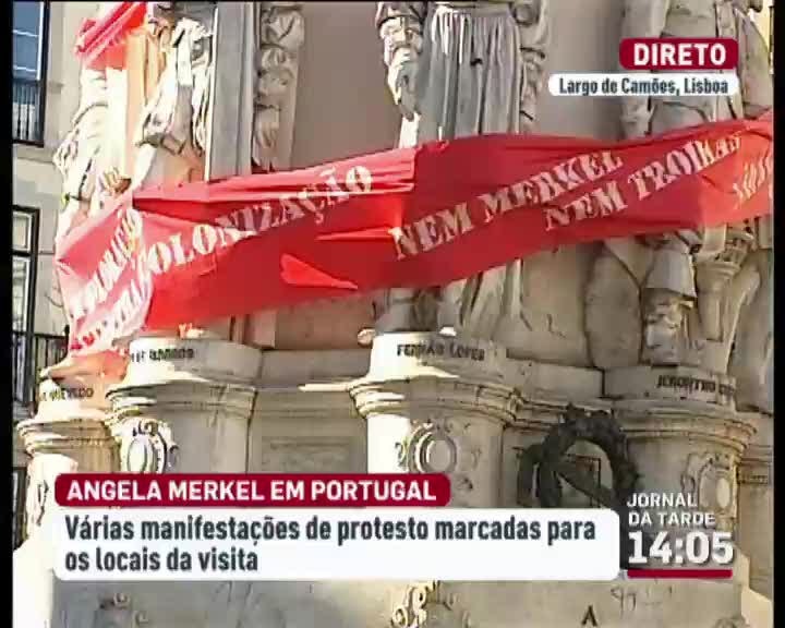 Não foram muito visíveis as manifestações contra a visita de Angela Merkel a Portugal e, no largo do Chiado, algumas horas antes de um protesto apenas algumas bandeiras se viam como sinal de protesto.