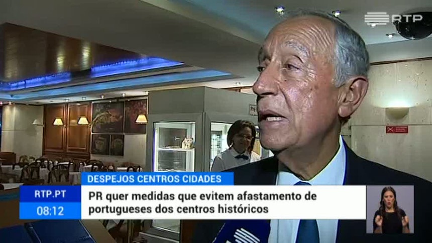 O Presidente da República pede medidas que evitem o afastamento dos portugueses dos centros das cidades. Marcelo Rebelo de Sousa esteve na Pastelaria Suíça, em Lisboa, que vai encerrar após a compra do edifício por estrangeiros.