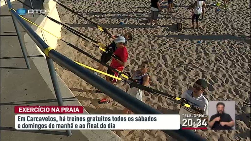 Na praia de Carcavelos há exercício físico todos os fins-de-semana de manhã e ao final do dia.