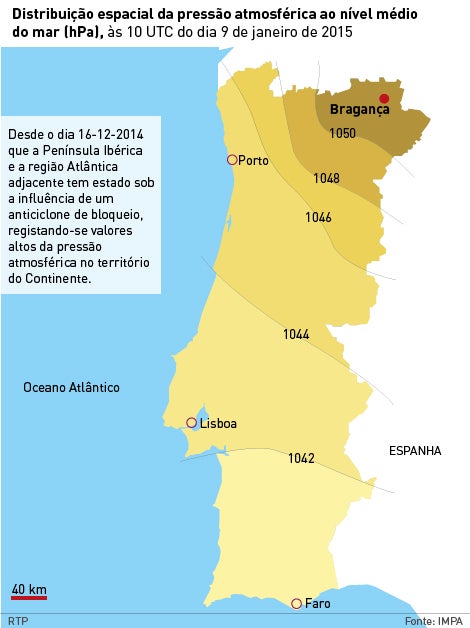 O especialista disse ainda que “os valores altos têm ocorrido em quase todo o Continente, acima dos 1040 hPa (a unidade para medir a pressão atmosférica). Este é um valor muito invulgar em Portugal, mas comum na Sibéria ou no Alasca".