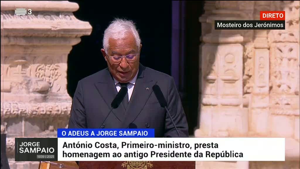 António Costa elogia as qualidades pessoais de Jorge Sampaio, mas também as qualidades políticas e as lutas sociais que travou, na intervenção na cerimónia de homenagem no Mosteiro dos Jerónimos.