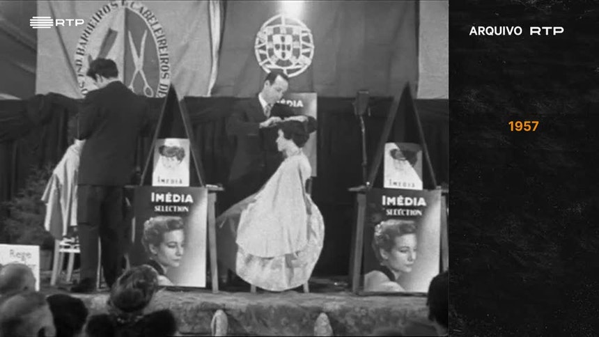 Novas técnicas de pentear, eis a modernice que os Grémios dos Industriais Barbeiros e Cabeleireiros do Porto e de Lisboa apresentam, em 1957, no vasto salão da F.N.A.T..