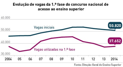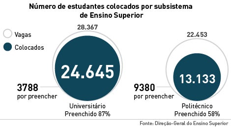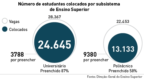 A taxa de ocupação das vagas foi de 74%, tendo sobrado das 50.820 vagas iniciais 13.168 para a segunda fase de acesso. Destas, 3.788 são em universidades e 9.380 em institutos politécnicos, o que denota a maior procura pelo ensino universitário. No ano passado, a taxa de ocupação de vagas era mais baixa dois por cento (72%).