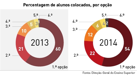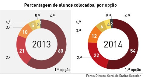 Dos alunos colocados nesta primeira fase, 88% foram-no numa das três primeiras opções da folha de candidatura. Mais de metade dos estudantes aceites (54%) entrou na primeira opção.
