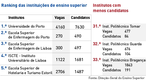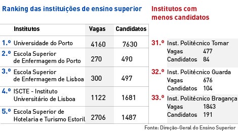 No que se refere à procura por instituição de Ensino Superior, há seis em que a procura excede a oferta, estando no topo da lista a Universidade do Porto. Seguem-se a Escola Superior de Enfermagem do Porto, a Escola Superior de Enfermagem de Lisboa, o ISCTE, a Universidade Nova de Lisboa e a Escola Superior de Hotelaria e Turismo do Estoril.