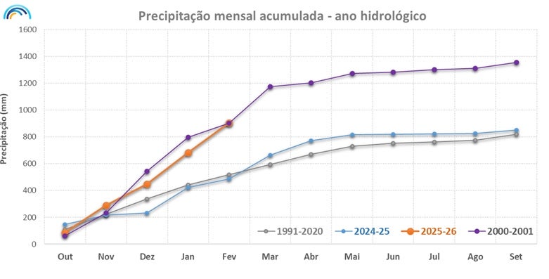 No que diz respeito à situação hidrológica, o acumulado desde 1 de outubro (início do ano hidrológico) até 15 de fevereiro é de 905.6 mm, "correspondendo a 1.8 vezes o valor médio e superando o ano hidrológico de 2000/01, até agora referência dos últimos 25 anos".