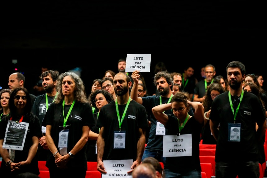 Dezenas de investigadores científicos manifestaram-se de t-shirt preta, junto à antiga FIL, em Lisboa, onde decorre o Encontro Ciência 2018 em protesto.