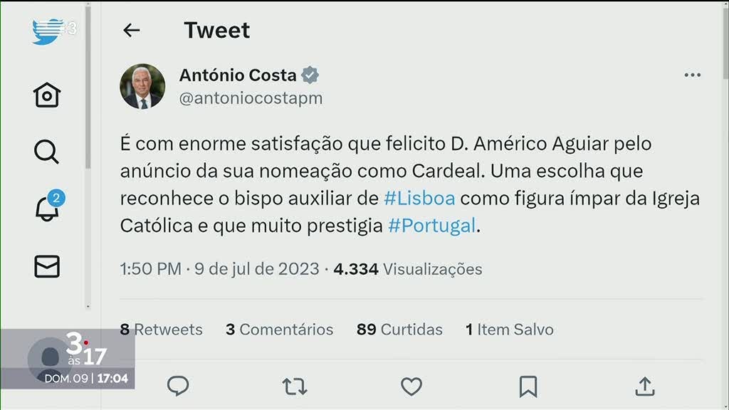 No Twitter, António Costa escreveu que a nomeação de D. Américo Aguiar "reconhece o bispo auxiliar de #Lisboa como figura ímpar da Igreja Católica" e "muito prestigia #Portugal".