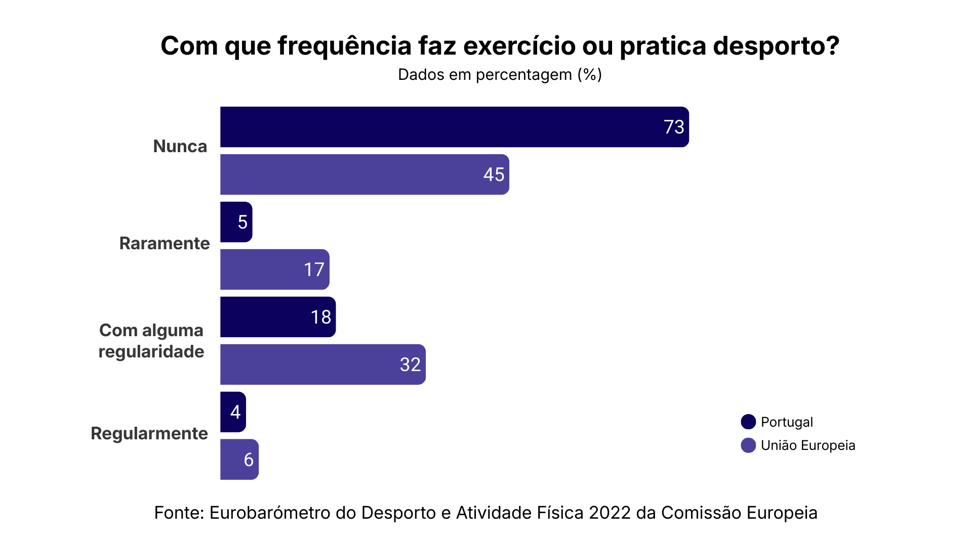 De acordo com o Eurobarómetro do Desporto e Atividade Física, publicado pela Comissão Europeia, 18 por cento dos portugueses diz praticar desporto com “alguma regularidade” e apenas quatro por centro “regularmente”, valores sempre abaixo da média na Europa.