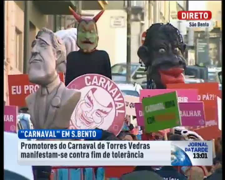 Por não haver tolerância de ponto no Carnaval, os foliões de Torres Vedras levaram as máscaras, em protesto, até junto à residência do primeiro-ministro. Mais de uma centena de pessoas manifesta-se a esta hora em São Bento. A ideia é mostrar, de forma irónica, que o Carnaval não é só para brincar porque movimenta muito dinheiro na economia local e vai movimentar menos este ano.