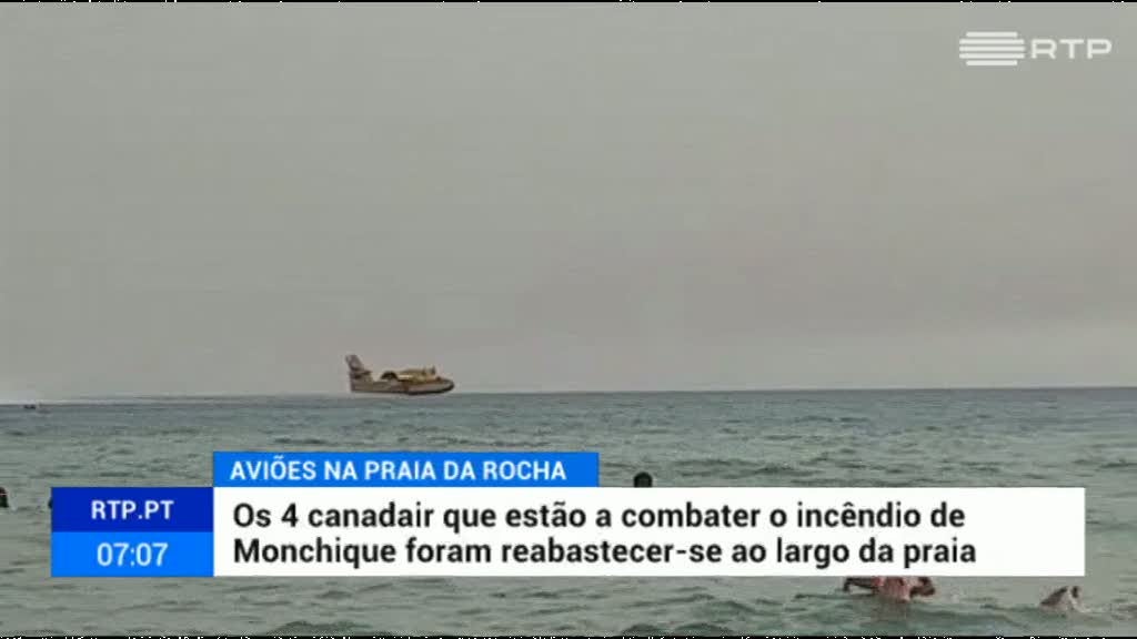 Os aviões Candair que estão a combater o incêndio de Monchique abastecem os tanques no mar, ao largo da Praia da Rocha, em Portimão. Os banhistas foram surpreendidos pela operação.