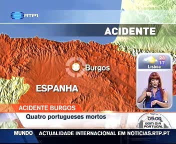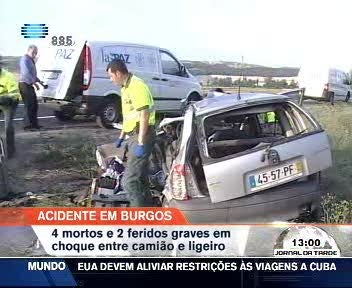 Quatro portugueses, todos da mesma família, morreram esta manhã quando o carro em que seguiam colidiu com um camião na província espanhola de Burgos (norte de Espanha). O acidente ocorreu ao quilómetro 254 da estrada N-1, que liga Madrid a Irún, junto do município de Quintanapalla, cerca das 06h05 (07h05 em Lisboa). As quatro vítimas mortais regressavam a Portugal depois de terem ido visitar um familiar à Alemanha.