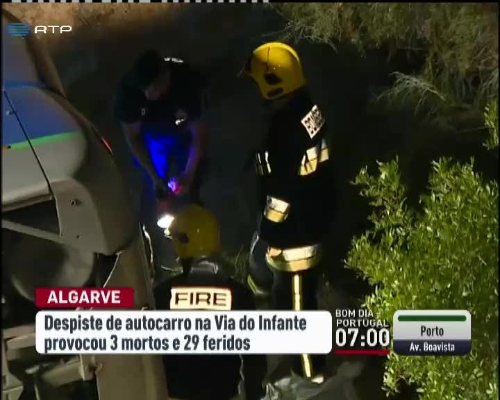 Um desastre rodoviário no Algarve provocou na última noite três mortos e 27 feridos. Um autocarro despistou-se na Via do Infante e caiu numa ravina cerca das 23h00 de quarta-feira. O veículo transportava turistas holandeses que haviam chegado pouco antes ao Aeroporto de Faro. Iam para Armação de Pêra, Praia da Rocha e Loulé.