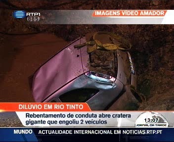 O rebentamento de uma conduta de água em Rio Tinto provocou uma cratera de grandes dimensões que engoliu duas viaturas, danificou outras vinte e alagou várias garagens. A empresa responsável pela conduta, a "Águas do Douro e Paiva", já garantiu que assume todas as responsabilidades pelo sucedido.