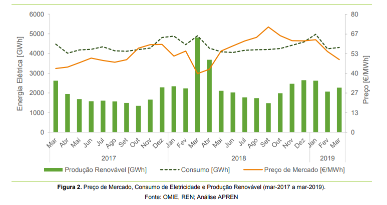 De acordo com o Boletim Eletricidade Renovável da APREN, relativo a março de 2019, uma grande fatia da energia produzida em Portugal ainda tem como base as centrais de consumo fóssil, ocupando as centrais a carvão a maior fatia (18,7 por cento), seguidas do gás natural (12,3 por cento) e da cogeneração fóssil com 10,4 por cento, contribuindo ainda com uma produção de 2,9 milhões de toneladas de emissões de CO2 para o ambiente.