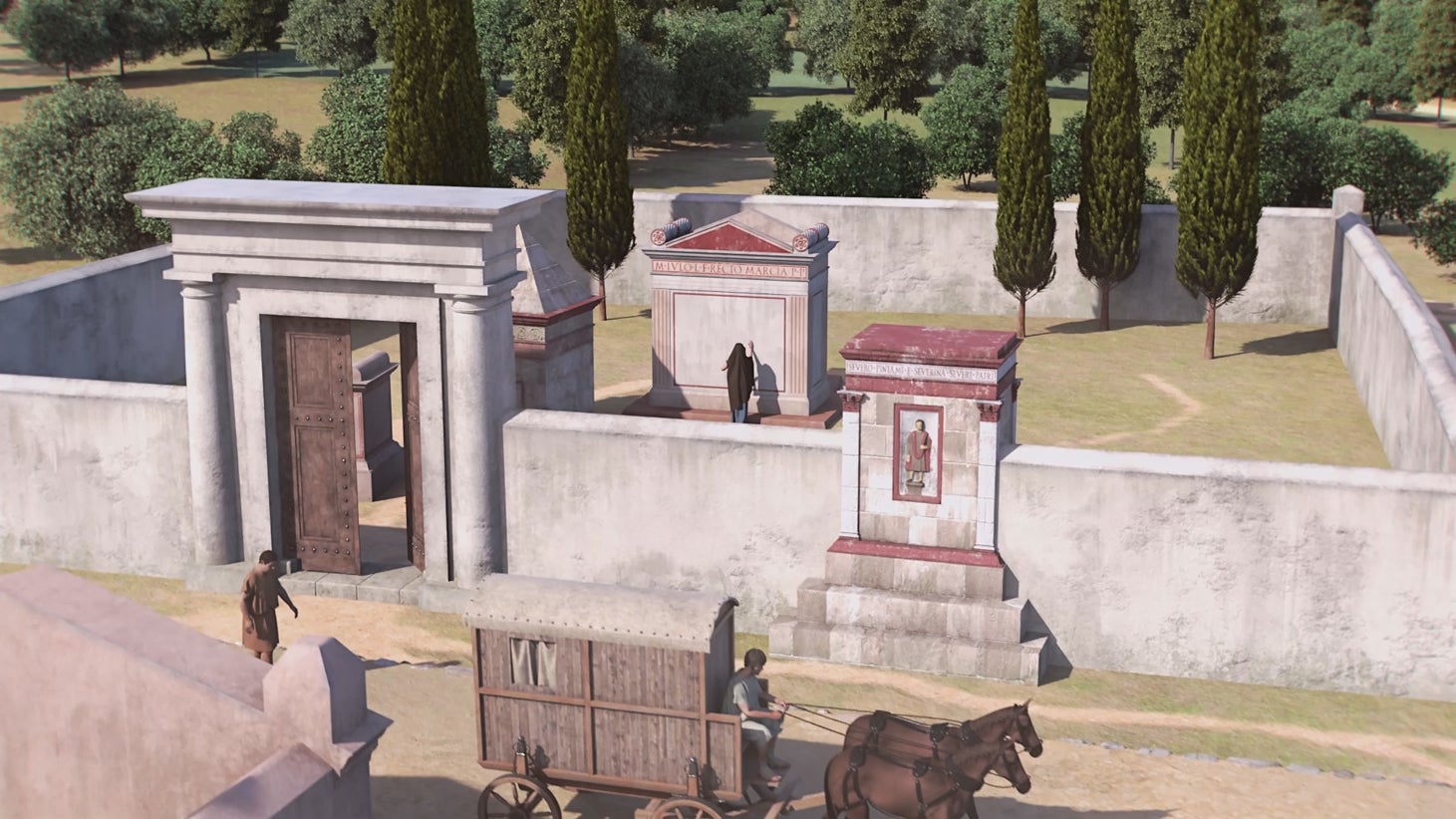 As necrópoles localizadas na periferia da urbe pulverizavam-se, assim, em torno das principais estradas de saída/entrada, onde as estruturas funerárias incluíam inscrições grafadas na pedra com o nome do morto e votos para a paz eterna.