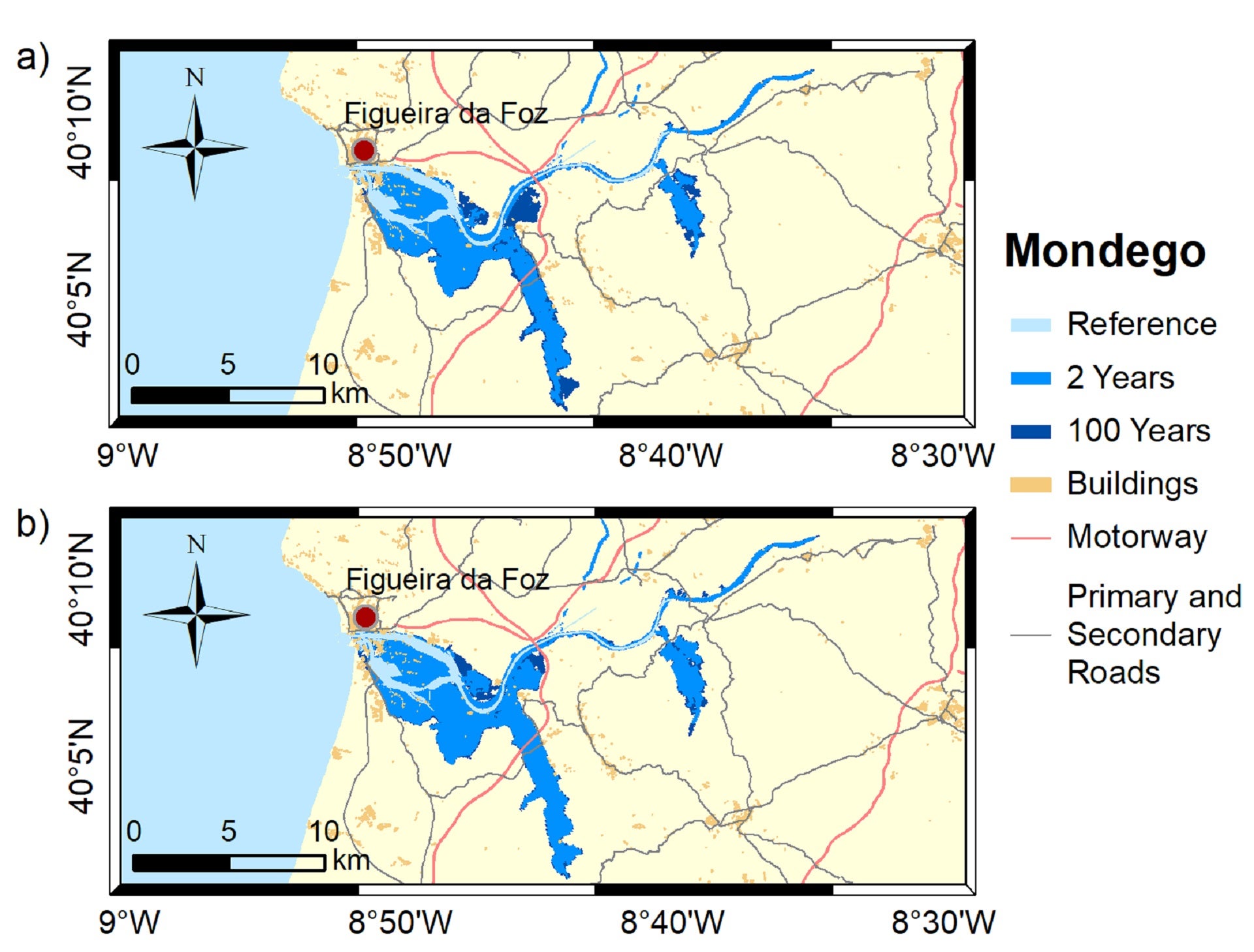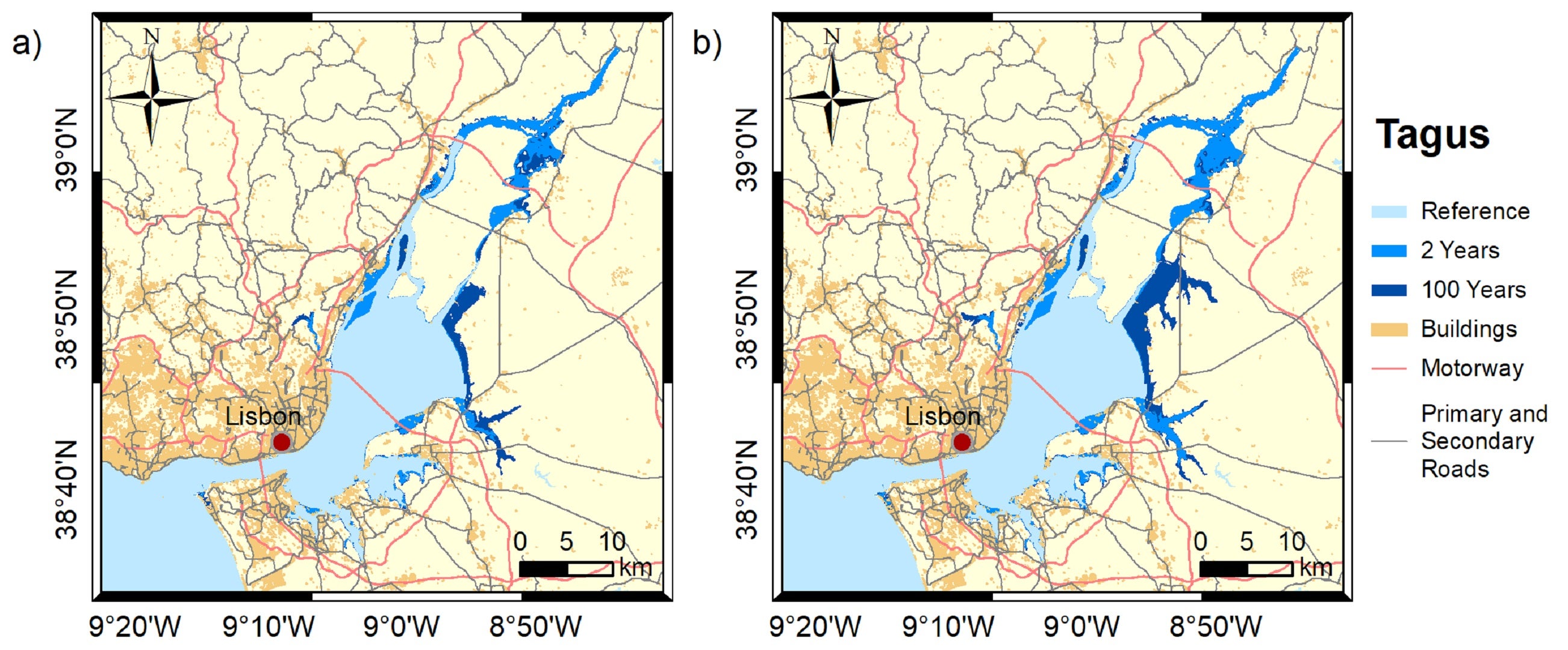 No estuário do Tejo, no ano de 2055, cerca de 11 quilómetros quadrados de zonas urbanas - onde para além de zonas habitacionais se incluem áreas industriais, estradas e outros elementos edificados – vão com cada vez com maior frequência estar alagados devido ao efeito combinado da maré, da subida do nível médio do mar e em consequência de fenómenos meteorológicos extremos que podem ocorrer uma vez a cada 100 anos.