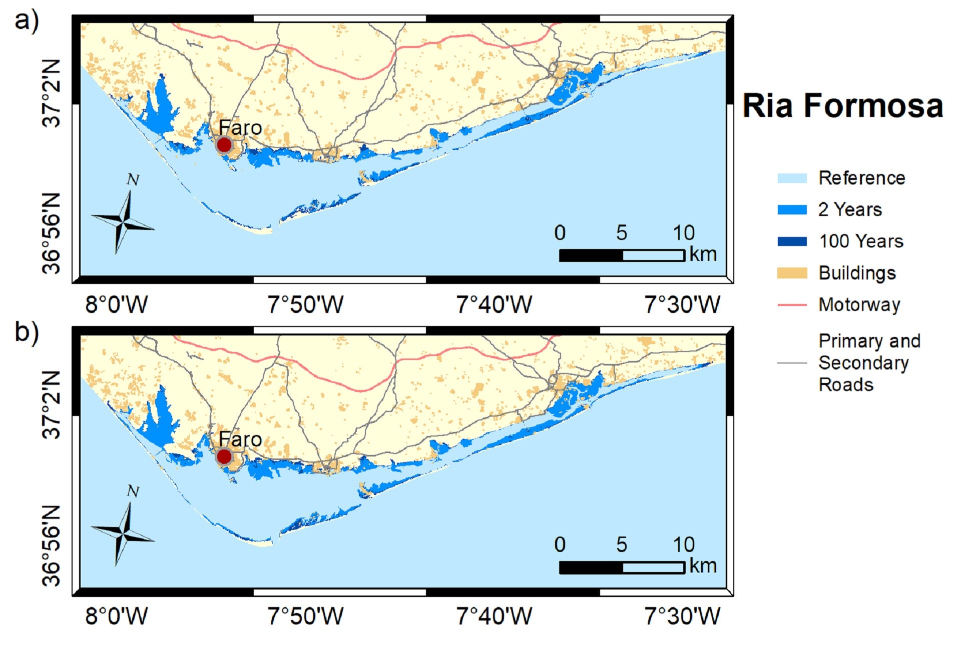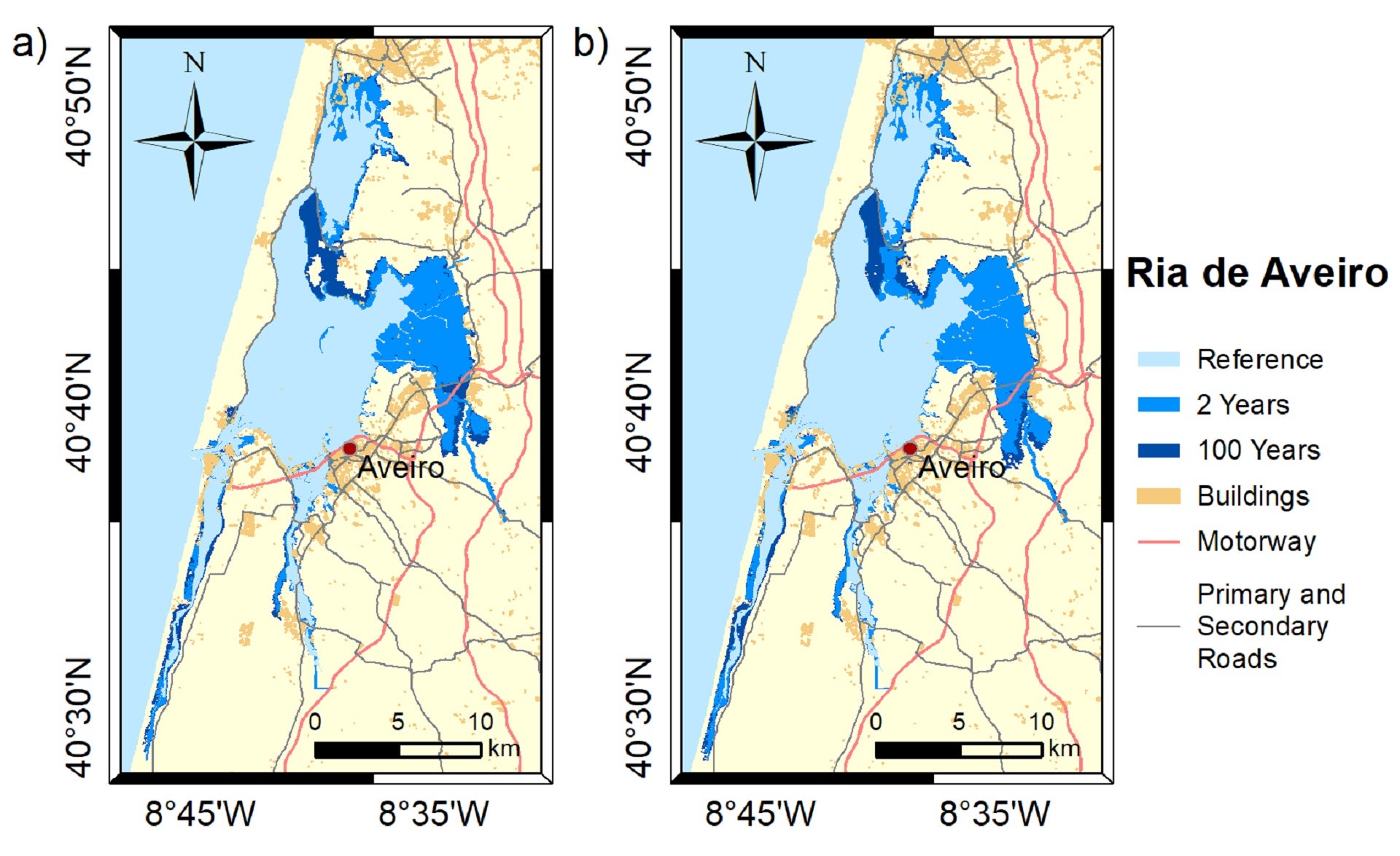 Os investigadores da UA verificaram ainda que “a onda de inundação é amplificada nas regiões a montante da entrada dos estuários do Tejo e Sado, devido à sua configuração geométrica divergente”. No entanto, “esta amplificação não resulta num aumento da área inundada, uma vez que as regiões adjacentes à entrada destes estuários apresentam cotas relativamente elevadas”. Por tudo isto, “concluímos que os modelos de inundação simplificados projetam extensões de inundação particularmente exageradas na Ria de Aveiro e nos estuários do Mondego e Tejo”.