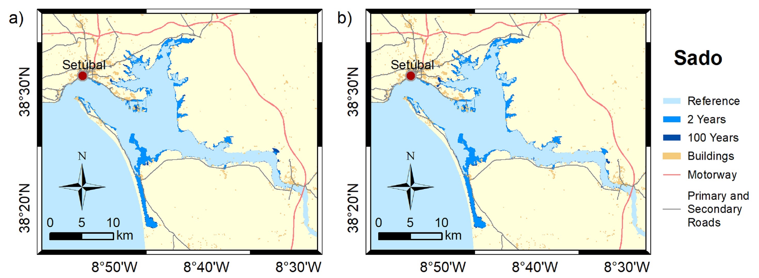 • Estuário do Sado com 43,5 km2 em 2055 e 44,9 até 2100 com mais e 2.500 pessoas afetadas em 2055 e cerca de cinco mil até 2100;