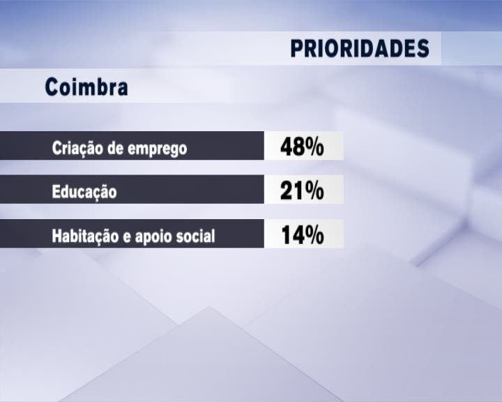 Coimbra, concelho com mais de 134 mil habitantes, continua a ser uma das principais cidades disputadas nas eleições autárquicas. Se uma das questões mais mediáticas desta campanha tem sido a promessa de transformação do aeródromo local em aeroporto internacional, a maioria dos coimbrenses inquiridos coloca a criação de emprego no topo das preocupações (48 por cento diz que essa deve ser a principal prioridade da Câmara).