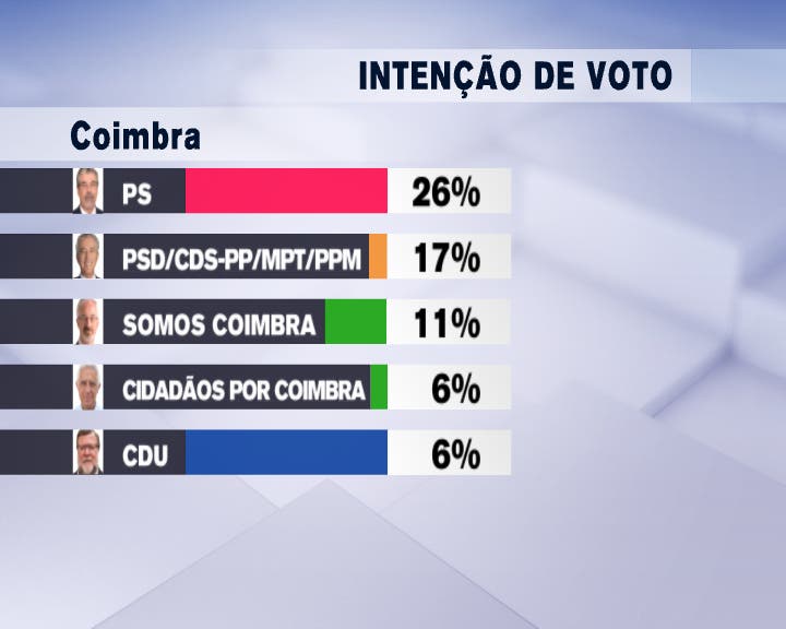 Segundo os dados da intenção direta de voto, o Partido Socialista arrecada 26 por cento, ao qual se seguem o candidato do PSD e o movimento “Somos Coimbra”, com 17 e 11 por cento, respetivamente. O candidato do movimento “Cidadãos por Coimbra” e a CDU tem precisamente a mesma percentagem de intenção de voto (seis por cento).