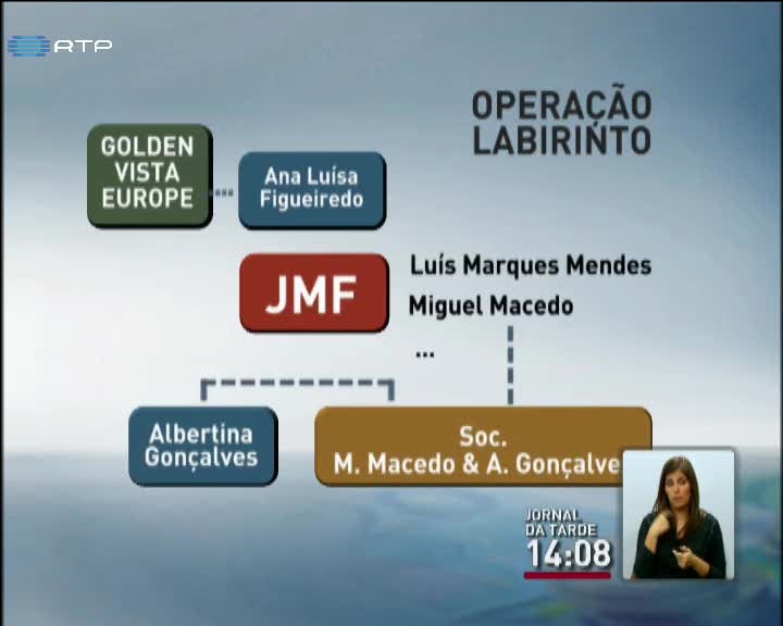 A RTP tem novas revelações sobre um dos maiores escândalos de corrupção envolvendo altos quadros do Estado: o esquema para a atribuição de vistos gold. Uma das empresas que está a ser investigada é a JMF Projects & Business. Um dos sócios fundadores foi o atual ministro da administração interna. Outro foi Luís Marques Mendes. E desta empresa faz também parte a filha do principal suspeito do caso, António Figueiredo, presidente do Instituto de Registos e Notariado. Miguel Macedo desvinculou-se da JMF no ano em que foi para o governo. Contactado pela RTP, Marques Mendes garante que também se desvinculou na mesma altura e sublinha que, nessa época, ainda não existiam vistos gold.