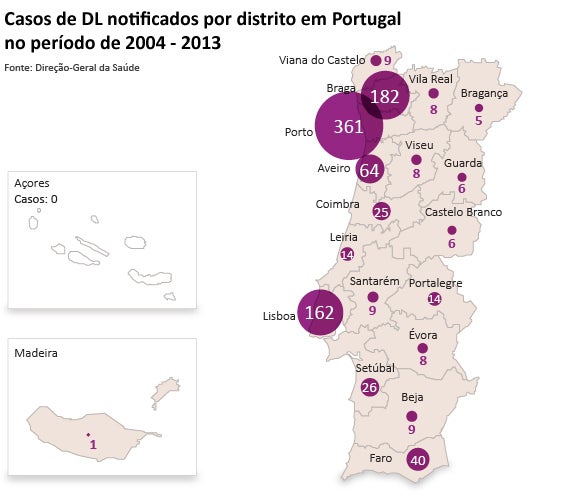 Analisado este período, os casos apresentam uma distribuição assimétrica no território nacional. Nos distritos do Porto, Lisboa e Braga verificaram-se 73 por cento das notificações de DL. É ainda importante referir que não houve qualquer caso notificado de DL na Região Autónoma dos Açores e apenas um na Região Autónoma da Madeira, regiões que registam assim a menor notificação de casos de DL.