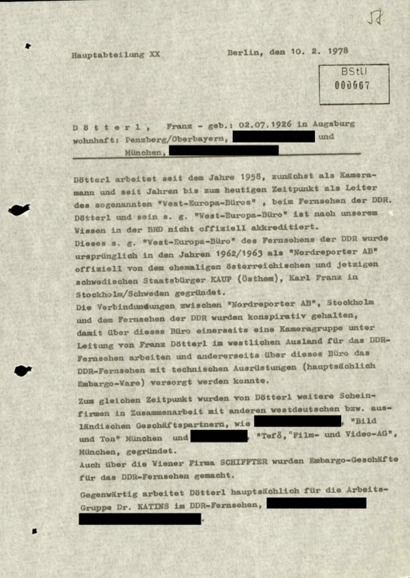 Dötterl começara em 1958 a trabalhar como operador de câmara para a televisão leste-alemã, mas em breve se tornaria o responsável pela rede de correspondentes ocidentais e pela aquisição de diverso material técnico para a televisão da RDA. A coberto de firmas fictícias como a "Nordreporter" sediada em Estocolmo, e com precauções conspirativas, ele furava o embargo ocidental às exportações de tecnologia avançada, como pode confirmar-se na documentação da Stasi a que a RTP teve acesso.