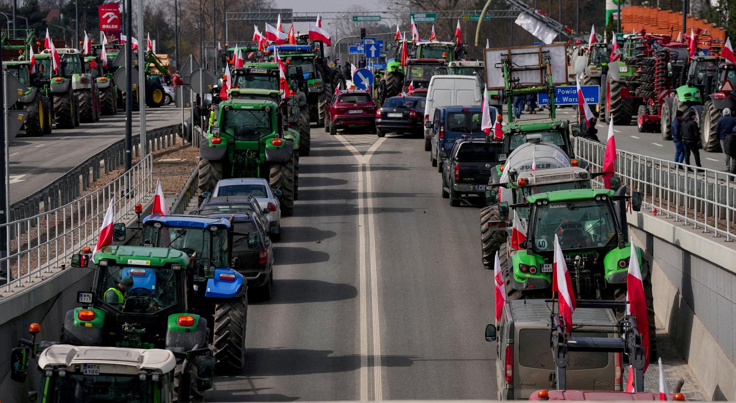 Os agricultores polacos bloqueiam as estradas em Zakretna, perto de Varsóvia, na Polónia. Protestam contra as importações de alimentos baratos da Ucrânia e as restrições que lhes são impostas pelo Pacto Ecológico da UE para combater as alterações climáticas | Aleksandra Szmigiel - Reuters
