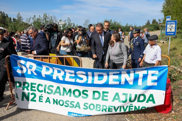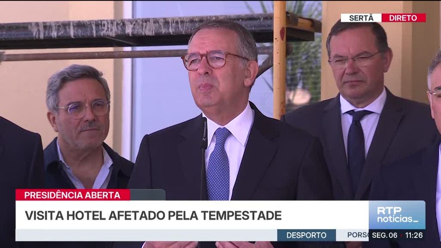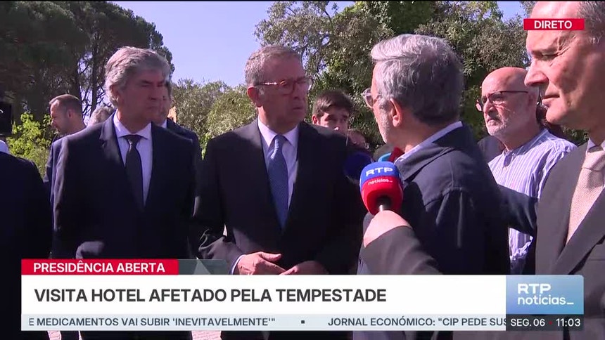 O Presidente da República está a visitar um hotel que foi afetado pela tempestade. Antes mesmo de chegar, saiu do carro para falar com pessoas que protestavam por um corte de estrada.