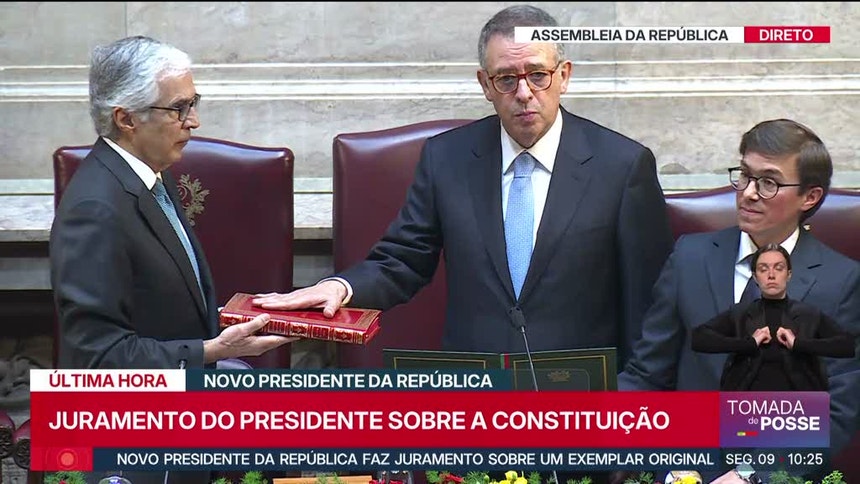 O Presidente eleito levanta-se e presta juramento sobre a Constituição da República Portuguesa.