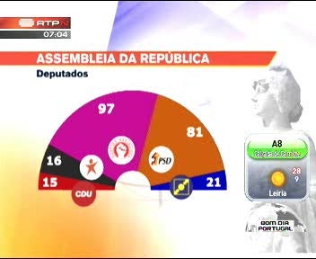 Quanto à composição do Parlamento em termos de distribuição de deputados e em resultado das eleições legislativas o PS apresenta 97 eleitos, o PSD 81, o CDS-PP 21, o BE 16 e a CDU 15 deputados eleitos.