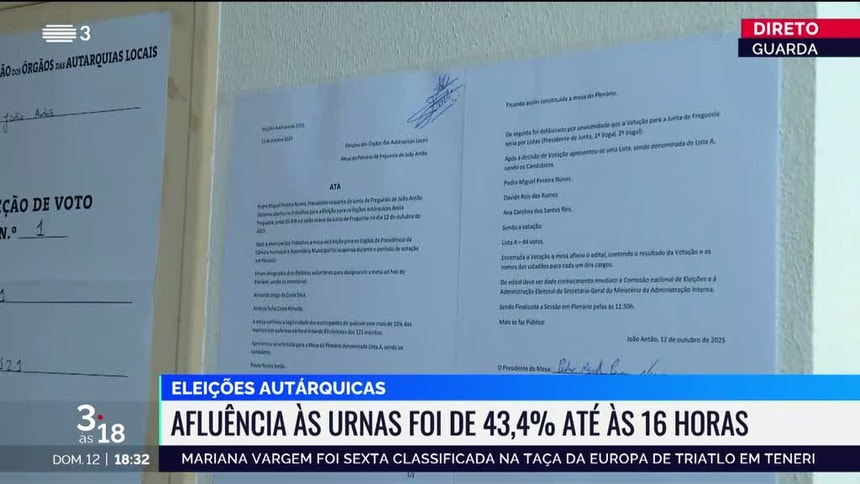 Este é um valor que excede aquele que foi registado, à mesma hora, há quatro anos: 42,34 por cento, a menor participação de sempre em eleições autárquicas.