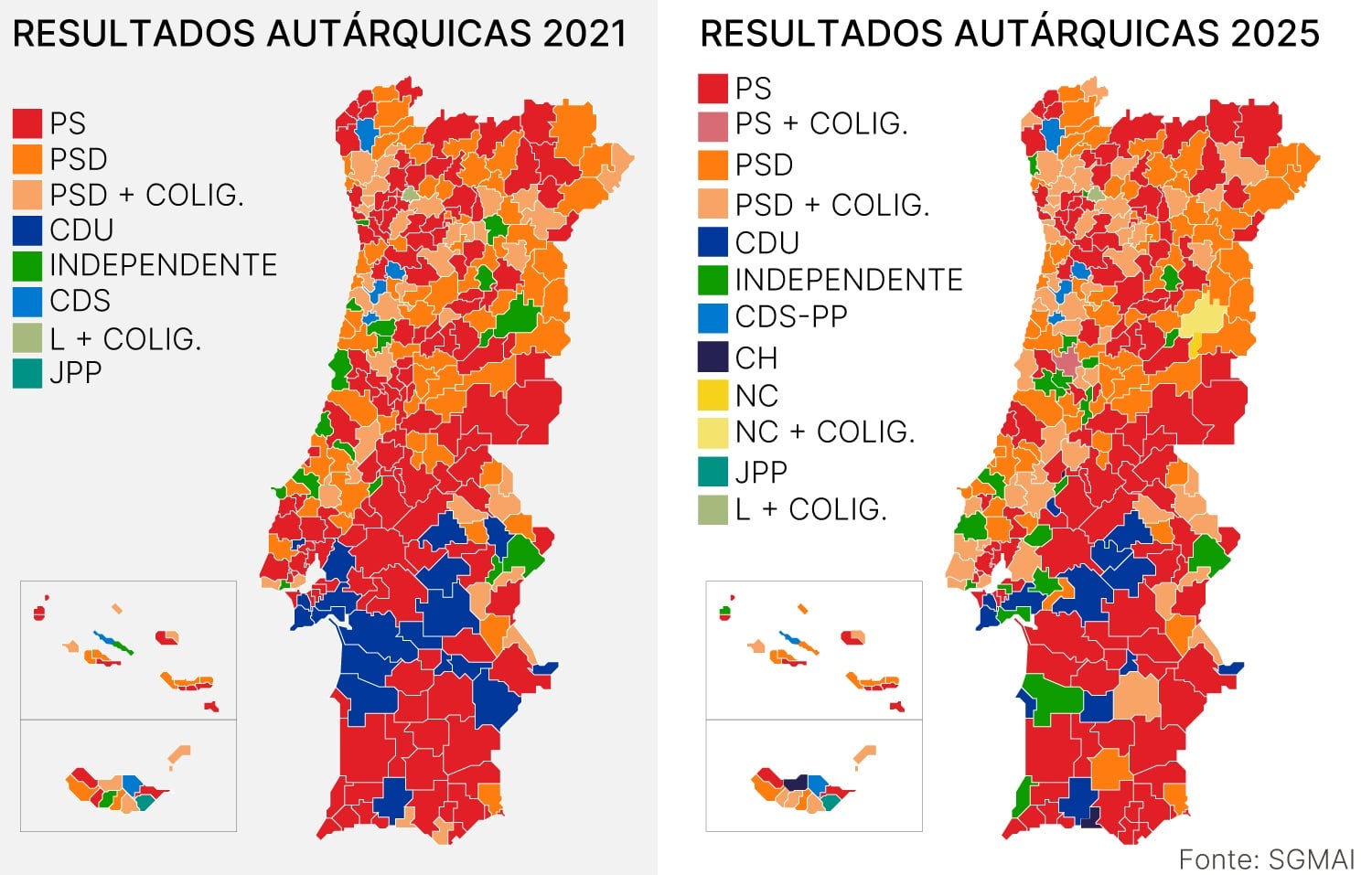 Olhando para o país como um todo, o mapa surge pintado em tons de laranja e vermelho. O PSD leva, no entanto, vantagem, com mais câmaras e centros urbanos populosos, como Sintra, Gaia, Lisboa e Porto. O PS, por sua vez, recupera capitais de distrito.