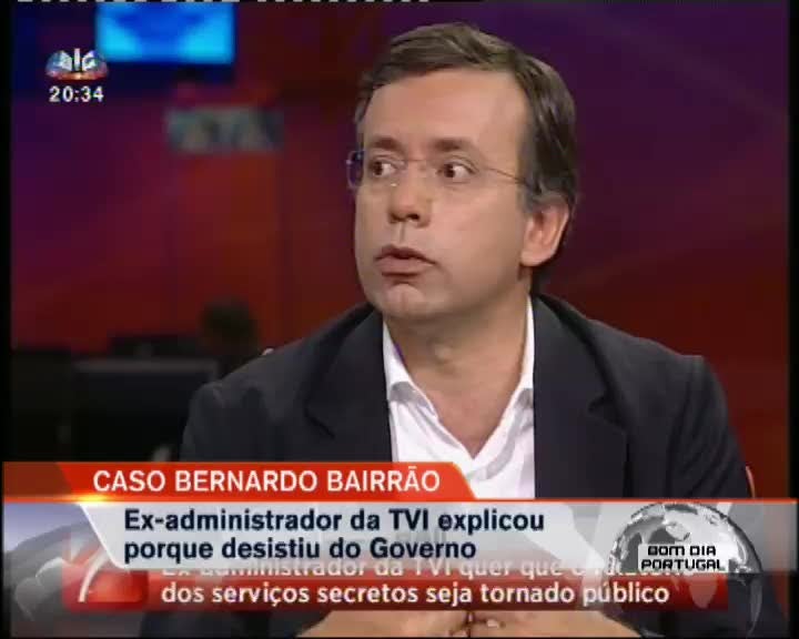 Bernardo Bairrão diz que nunca lhe falaram de qualquer informação obtida através dos serviços secretos. O ex-administrador da TVI garantiu ontem à SIC que foram informações que circulavam sobre alegados negócios em Angola e no Brasil que o fizeram desistir de ser secretário de Estado. Revelou, também, que pediu à Media Capital para fazer uma auditoria aos negócios que fez enquanto gestor.