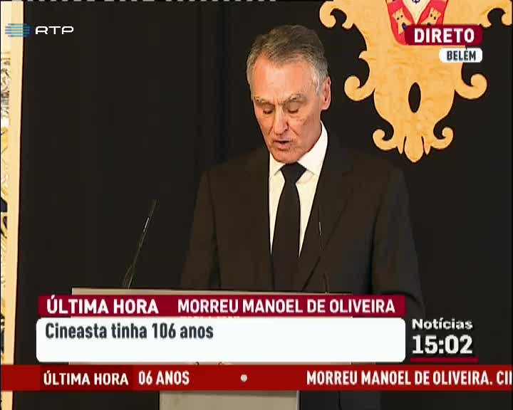 Morreu aos 106 anos o cineasta português Manoel de Oliveira. Cavaco Silva deixou uma mensagem de condolências, em direto de Belém, sobre "um dos nomes mais significativos da história da sétima arte". O Presidente da República lamentou a perda de "um dos maiores vultos" da cultura contemporânea portuguesa.