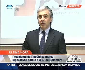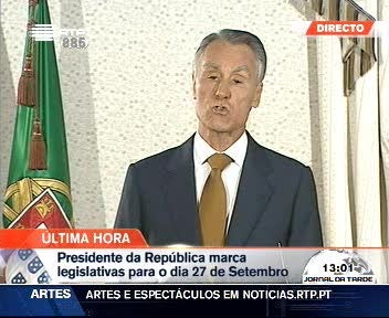 O Presidente da República, Aníbal Cavaco Silva, anunciou o dia 27 de Setembro para a realização das eleições legislativas. A comunicação ao país foi feita pouco depois das 13 horas e aconteceu um dia depois do Governo ter marcado as eleições autárquicas para o próximo dia 11 de Outubro.