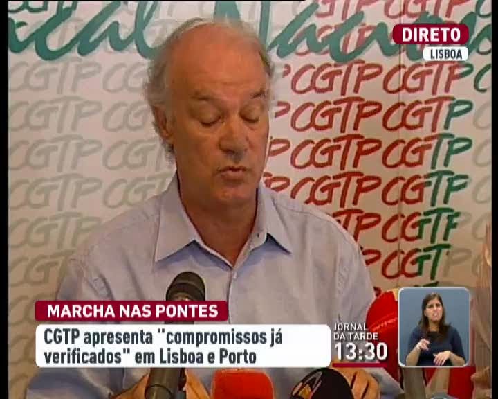 A uma semana das ações de protesto previstas para o Porto e Lisboa, a CGTP mantém a convicção de que estão reunidas todas as condições para que os seus manifestantes desfilem no tabuleiro da Ponte 25 de Abril. Uma posição testemunhada em direto este domingo pela repórter da RTP Fernanda Fernandes.