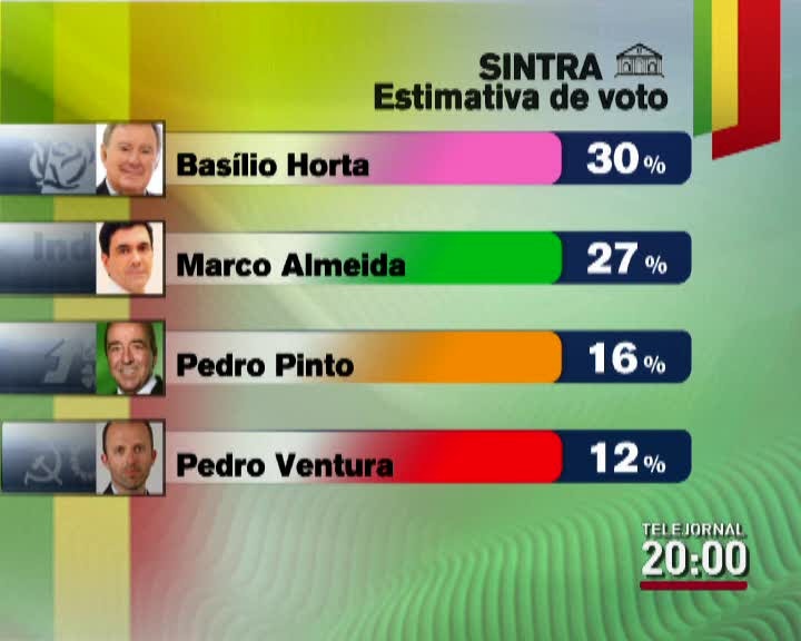 Uma grande sondagem da Universidade Católica para a RTP atribui a vitória nesses dois concelhos ao PS. Em Sintra, Basílio Horta está à frente na corrida eleitoral, seguido de perto pelo independente Marco Almeida. A diferença entre os dois é de apenas 3 pontos. O candidato do PSD e CDS fica muito atrás.