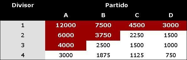 Partido A - 3 deputados, correspondentes aos quocientes 12000 (1.º eleito), 6000 (3.º eleito) e 4000 (5.º eleito). Note-se que apesar do quociente resultante da divisão por 4 ser 3000, igual aos votos obtidos pelo partido D, o mandato é atribuído ao menos votado, isto é ao Partido D, que assim elege o seu deputado.