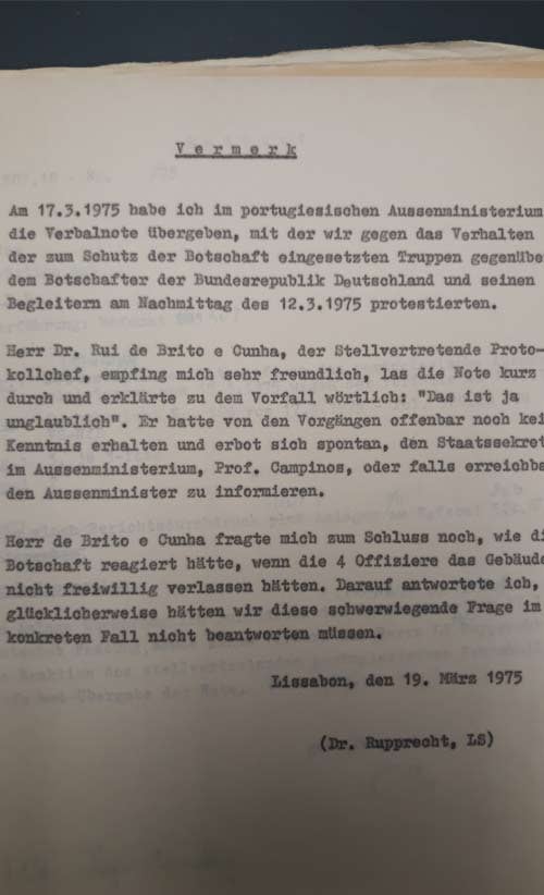 Não há notícia de o Auswärtiges Amt (o MNE alemão) ter repreendido o embaixador por considerar excessiva a autonomia com que decidiu. Pelo contrário, o AA elaborou um documento recordando os princípios por que se rege a concessão de asilo diplomático e esclarecendo desde logo que nenhum convénio bilateral nem nenhum direito internacional permitia à Embaixada conceder asilo diplomático aos quatro oficiais golpistas. Apenas lhes podia ser concedido, acrescentava o documento, um refúgio temporário perante perigo julgado iminente para a sua segurança física. Para ajuizar da realidade desse perigo, concluía, ninguém melhor do que os diplomatas confrontados com a situação, que teriam por isso de decidir com certa autonomia.