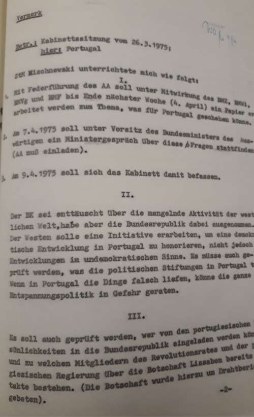 Enquanto as diligências nesse sentido não produzissem efeitos, o Governo de Bona ia tomando as suas próprias iniciativas. Insistia com a Embaixada para que elaborasse listas de personalidades, especialmente militares, a convidar para visitas à Alemanha. Tratava de coordenar a sua intervenção com a das fundações partidárias, desde logo com a Fundação Ebert. E, principalmente, encorajava a intensa colaboração de Fritz Caspari, o embaixador alemão, com o seu homólogo norte-americano, Frank Carlucci. Ambos tinham em comum a convicção, contrária à de Henry Kissinger, de que uma receita inspirada no Chile de Pinochet, ou no bloqueio a Cuba, não daria resultado em Portugal. E ambos apostavam, por isso, em derrotar a revolução com uma táctica que passasse necessariamente pelas eleições.