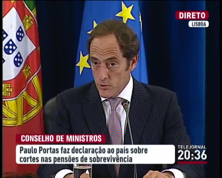 O vice-primeiro-ministro Paulo Portas anunciou a aprovação em Conselho de Ministros sobre da proposta sobre "condição de recursos" para as pensões de sobrevivência. Segundo essa proposta, sofrerão cortes as acumulações de pensões acima de 2.000 euros. Portas queixou-se ainda de tentativas de ter havido, alegadamente, tentativas pouco escrupulosas de "alarmar os idosos".