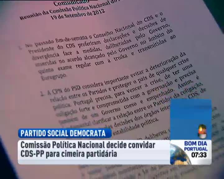 "A Comissão Política Nacional do PSD deliberou convidar o CDS para uma reunião conjunta das direções partidárias, a ter lugar com a maior brevidade possível, com o intuito de obter a indispensável manifestação de apoio ao acordo político de coligação celebrado em 16 de junho de 2011, assim como às decisões e estratégia do Governo em matéria de consolidação orçamental e ajustamento estrutural, visando uma trajetória de crescimento sustentável", lia-se ao início da madrugada num comunicado distribuído à comunicação social, decorria ainda a reunião Comissão Política Nacional do PSD.